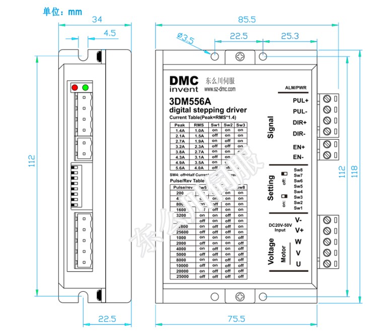 3DM556A型驅(qū)動(dòng)器,具有更低的電機(jī)發(fā)熱、運(yùn)行噪聲和更高的平穩(wěn)性,以及更低的成本,主要驅(qū)動(dòng)57型三相混合式步進(jìn)電機(jī)。其微步細(xì)分?jǐn)?shù)有15種,最大步數(shù)為25000Pulse/rev;其工作峰值電流范圍為1.4A-5.6A,輸出電流共有8檔,電流的分辨率約為0.7A;具有自動(dòng)半流,過(guò)壓和過(guò)流保護(hù)等功能。本驅(qū)動(dòng)器為直流供電,建議工作電壓范圍為24VDC-36VDC,電壓不超過(guò)50VDC,不低于20VDC。